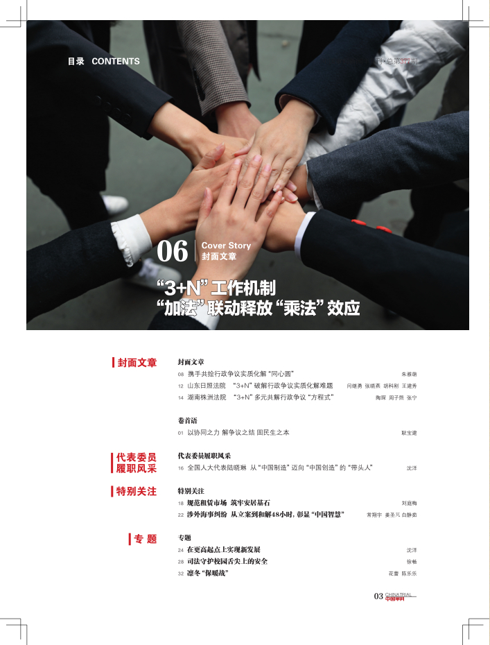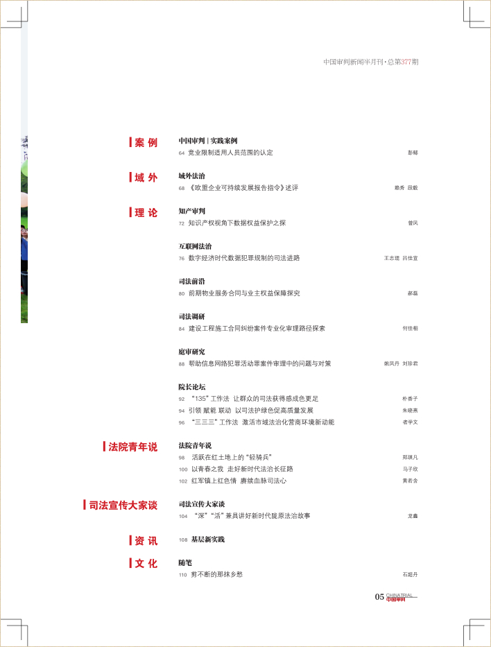 卷首语 01 以协同之力 解争议之结 固民生之本 耿宝建 封面文章 08 携手共绘行政争议实质化解“同心圆” 朱雅萌 12 山东日照法院 “3+N”破解行政争议实质化解难题 闫继勇 张晓燕 胡科刚 王建秀 14 湖南株洲法院 “3+N”多元共解行政争议“方程式” 陶琛 周子熙 张宁 卷首语 01 以协同之力 解争议之结 固民生之本 耿宝建 代表委员履职风采 16 全国人大代表陆晓琳 从“中国制造”迈向“中国创造”的“带头人” 沈洋 特别关注 18 规范租赁市场 筑牢安居基石 刘庭梅 22 涉外海事纠纷 从立案到和解48小时,彰显“中国智慧” 常翔宇 姜圣芃 白静茹 专题 24 在更高起点上实现新发展 沈洋 28 司法守护校园舌尖上的安全 徐畅 32 凛冬“保暖战” 花蕾 陈乐乐 特别报道 36 凝心聚力 奋力“攻坚” 常翔宇 争创“枫桥式人民法庭” 38 江苏淮安洪泽东双沟法庭 小法庭绘就司法为民新画卷 费苏皖 田维维 40 广东东莞桥头法庭 以多元共治赋能城乡基层治理 张瑞岚 42 云南大理喜洲法庭 绘就蝴蝶泉边多元解纷新“枫”景 朱雅萌 法院传真 44 天津法院 上下协同 如为“我”执 李华 徐柏坚 张涛 46 湖北汉江法院 让公平正义在细处落地 吴涛 王淼 周法升 48 湖南娄底法院 “四层五环节”调解机制巧解万家忧 刘沁 梁成文 50 内蒙古准格尔旗法院 赋能暖城社会治理新“枫”景 张霞 韩志新 52 黑龙江伊春金林法院 构建“百业共调”的“和合共治”多元解纷新格局 常翔宇 姚琦美 54 浙江浦江法院 司法守护上山文化遗产 黄铭萱 盛婉丽 郑佳慧 56 福建南靖法院 让家事审判有力度更有温度 魏明东 郑国宝 58 广东湛江霞山法院 以全流程调解走出实质解纷新路 黄宏林 陈嘉慧 感受法官 60 牛占龙 “干好工作就要发扬‘三牛’精神” 索未 62 贾李强 “公平正义之路只会越走越宽” 张蕾 中国审判 | 实践案例 64 竞业限制适用人员范围的认定 彭鄢 域外法治 68 《欧盟企业可持续发展报告指令》述评 赖秀 段毅 知产审判 72 知识产权视角下数据权益保护之探 曾凤 互联网法治 76 数字经济时代数据犯罪规制的司法进路 王志琨 吕佳宣 司法前沿 80 前期物业服务合同与业主权益保障探究 郝磊 司法调研 84 建设工程施工合同纠纷案件专业化审理路径探索 何佳栩 庭审研究 88 帮助信息网络犯罪活动罪案件审理中的问题与对策 姚凤丹 刘珍君 院长论坛 92 “135”工作法 让群众的司法获得感成色更足 朴香子 94 引领 赋能 联动 以司法护绿色促高质量发展 朱晓燕 96 “三三三”工作法 激活市域法治化营商环境新动能 者学文 法院青年说 98 活跃在红土地上的“轻骑兵” 郑琪凡 100 以青春之我 走好新时代法治长征路 马子欣 102 红军镇上红色情 赓续血脉司法心 黄若含 司法宣传大家谈 104 “深”“活”兼具讲好新时代陇原法治故事 龙鑫 108 基层新实践 随笔 110 剪不断的那抹乡愁 石超丹