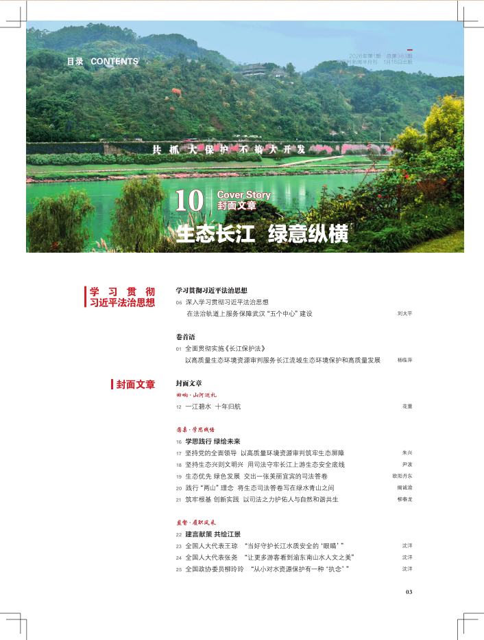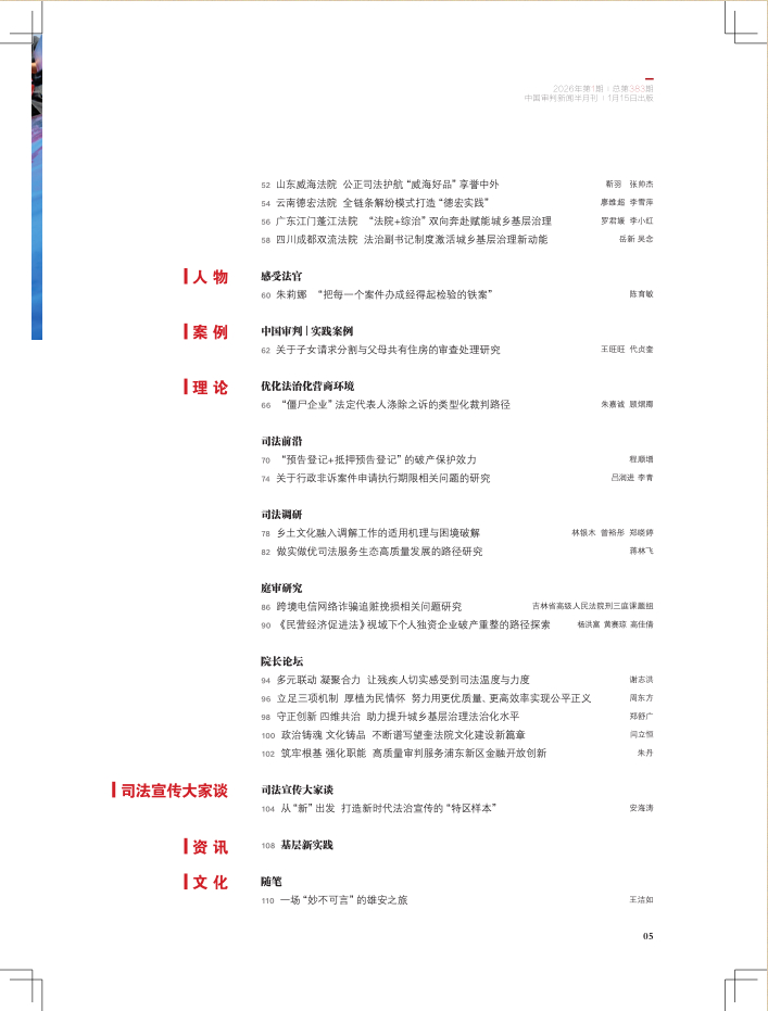 卷首语 01 全面贯彻实施《长江保护法》 以高质量生态环境资源审判服务长江流域生态环境保护和高质量发展 杨临萍 学习贯彻习近平法治思想 06 深入学习贯彻习近平法治思想 在法治轨道上服务保障武汉“五个中心”建设 刘太平 封面文章 回响·山河巡礼 12 一江碧水 十年归航 花蕾 圆桌·学思践悟 16 学思践行 绿绘未来 17 坚持党的全面领导 以高质量环境资源审判筑牢生态屏障 朱兴 18 坚持生态兴则文明兴 用司法守牢长江上游生态安全底线 尹波 19 生态优先 绿色发展 交出一张美丽宜宾的司法答卷 欧阳丹东 20 践行“两山”理念 将生态司法答卷写在绿水青山之间 揭诚渝 21 筑牢根基 创新实践 以司法之力护佑人与自然和谐共生 柳春龙 监督·履职风采 22 建言献策 共绘江景 23 全国人大代表王琼 “当好守护长江水质安全的‘眼睛’” 沈洋 24 全国人大代表张尧 “让更多游客看到渝东南山水人文之美” 沈洋 25 全国政协委员柳玲玲 “从小对水资源保护有一种‘执念’” 沈洋 口述·亲历者说 26 江声回荡 护水同行 27 “长江养活了我们,我们得守护它一辈子” 索南文扎 朱雅萌 28 “筑牢生态屏障,让一江清水永续东流” 范君团 朱雅萌 29 “让祖辈见过的清澈,继续流淌在后辈的门前” 陈汝金 朱雅萌 案件·司法表达 30 以案释法 和谐共生 31 庭审内外:守护长江的司法案例图鉴 沈洋 图片·山河绘卷 34 光影十年 法护不止 数读·见证变化 36 数说长江 司法担当 特别关注 38 “他是时刻把群众冷暖放在心里的贴心人” 朱雅萌 40 行政公益诉讼筑牢公共利益防护墙 沈洋 专题 42 奋力书写法院文化建设的创新答卷 刘莉 林泳 争创“枫桥式人民法庭” 46 辽宁庄河蓉花山法庭 引法治活水 润“无讼”乡土 刘青 董久妍 48 广东深圳南山沙河法庭 “三维发力”守护辖区路畅人安 丁晓敏 胡旦 法院传真 50 国家法官学院湖南分院 以训提能强队伍 以学促干护公正 花蕾 刘赛 52 山东威海法院 公正司法护航“威海好品”享誉中外 靳羽 张帅杰 54 云南德宏法院 全链条解纷模式打造“德宏实践” 廖维超 李雪萍 56 广东江门蓬江法院 “法院+综治”双向奔赴赋能城乡基层治理 罗君媛 李小红 58 四川成都双流法院 法治副书记制度激活城乡基层治理新动能 岳新 吴念 感受法官 60 朱莉娜 “把每一个案件办成经得起检验的铁案” 陈育敏 中国审判 | 实践案例 62 关于子女请求分割与父母共有住房的审查处理研究 王旺旺 代贞奎 优化法治化营商环境 66 “僵尸企业”法定代表人涤除之诉的类型化裁判路径 朱嘉诚 顾熠卿 司法前沿 70 “预告登记+抵押预告登记”的破产保护效力 程顺增 74 关于行政非诉案件申请执行期限相关问题的研究 吕润进 李青 司法调研 78 乡土文化融入调解工作的适用机理与困境破解 林银木 曾裕彤 郑晓婷 82 做实做优司法服务生态高质量发展的路径研究 蒋林飞 庭审研究 86 跨境电信网络诈骗追赃挽损相关问题研究 吉林省高级人民法院刑三庭课题组 90 《民营经济促进法》视域下个人独资企业破产重整的路径探索 杨洪富 黄赛琼 高佳倩 院长论坛 94 多元联动 凝聚合力 让残疾人切实感受到司法温度与力度 谢志洪 96 立足三项机制 厚植为民情怀 努力用更优质量、更高效率实现公平正义 周东方 98 守正创新 四维共治 助力提升城乡基层治理法治化水平 郑舒广 100 政治铸魂 文化铸品 不断谱写望奎法院文化建设新篇章 闫立恒 102 筑牢根基 强化职能 高质量审判服务浦东新区金融开放创新 朱丹 司法宣传大家谈 104 从“新”出发 打造新时代法治宣传的“特区样本” 安海涛 108 基层新实践 随笔 110 一场“妙不可言”的雄安之旅 王洁如