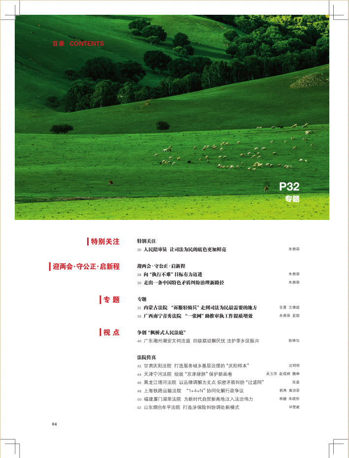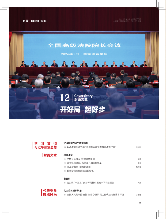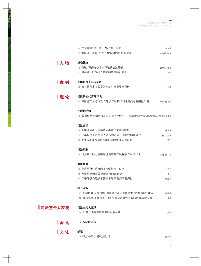 卷首语 01 为实现“十五五”良好开局提供更高水平司法服务 严浩 学习贯彻习近平法治思想 06 以高质量司法护航“因地制宜加快发展新质生产力” 李向阳 封面文章 14 严格公正司法 持续提质增效 沈洋 18 筑牢强国建设、民族复兴的文化根基 罗天 20 立足新起点 擘画新蓝图 韩民春 22 数读全国高级法院院长会议 代表委员履职风采 24 全国人大代表陈柏蓉 以匠心履职 助力做优法治化营商环境 田晓晓 特别关注 26 人民陪审员 让司法为民的底色更加鲜亮 朱雅萌 迎两会·守公正·启新程 28 向“执行不难”目标有力迈进 朱雅萌 30 走出一条中国特色矛盾纠纷治理新路径 朱雅萌 专题 32 内蒙古法院 “诉服轻骑兵”走到司法为民最需要的地方 花蕾 艾婧超 36 广西南宁青秀法院 “一张网”助推审执工作提质增效 朱雅萌 蓝娟 争创“枫桥式人民法庭” 40 广东潮州潮安文祠法庭 四级联动解民忧 法护茶乡促振兴 陈铮仪 法院传真 42 甘肃庆阳法院 打造服务城乡基层治理的“庆阳样本” 沈明明 44 天津宁河法院 绘就“京津绿肺”保护新画卷 吴玉萍 赵煜婷 魏峥 46 黑龙江塔河法院 以品牌调解为支点 织密矛盾纠纷“过滤网” 张晶 48 上海铁路运输法院 “1+4+N”协同化解行政争议 郭燕 黄诗原 50 福建厦门湖里法院 为新时代自贸新高地注入法治伟力 林姗 朱晓彤 52 山东烟台牟平法院 打造涉保险纠纷调处新模式 毕雪崴 54 广东中山二院 岐江“枫”红正当时 林海亮 56 重庆开州法院 守护“帅乡小候鸟”成长的晴空 出智周 张悦 感受法官 58 蒋敏 写好守护营商环境的法治答卷 白坤先 茹玉 60 包莉莉 让“四千”精神闪耀在执行路上 刘璐 中国审判 | 实践案例 62 相邻损害事实鉴定的启动与审查要点探析 刘欢 优化法治化营商环境 66 实际施工人与保理人建设工程款权利冲突的纾解路径研究 郑煦 徐雪晴 互联网法治 70 数据权益知识产权司法保护问题研究 浙江省杭州市中级人民法院知识产权法庭课题组 司法前沿 74 刑事开庭讯问程序的完善及优化路径探析 张明勇 78 私募投资有限合伙人退伙财产返还请求权问题研究 李冉 刘奕麟 82 债务人不履行执行和解协议的处理规则探析 施帅 司法调研 86 环资审判助力铁路环境治理的实践探索与路径优化 苏琦 陈小霞 庭审研究 90 电商平台经营者的连带侵权责任研究 兰丹丹 94 无接触交通事故赔偿责任问题研究 罗云 98 关于深度伪造技术犯罪中法律适用问题探讨 黄江南 院长论坛 102 积极培育 全面引领 用新时代法治文化助推“六型法院”建设 戚晏榕 104 履职尽责 狠抓落实 以高质量司法审判服务辖区高质量发展 汪松 司法宣传大家谈 106 让龙江法院好故事更加可感可触 黄河 110 基层新实践 随笔 112 怀为民初心 守司法温情 周英民