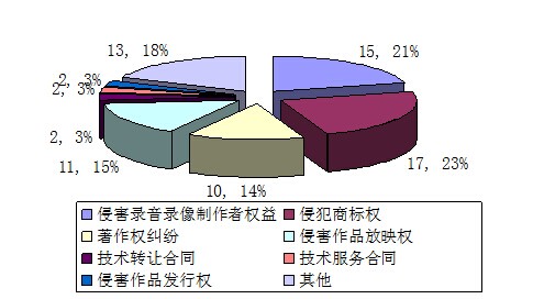 知识产权司法保护是人民法院依照法定程序审理专利、商标、著作权、技术合同、不正当竞争等案件的司法活动,涉及人民法院民事、行政、刑事审判三大领域。加强知识产权司法保护,对于安徽省铜陵市实施的创新驱动发展战略、推动文化繁荣、保障市场经济秩序具有重要作用。为充分发挥司法保护知识产权在铜陵建设创新型城市、争创国家知识产权示范市中的主导作用,安徽省铜陵市中级人民法院对近三年来铜陵法院审结的知识产权案件进行了专题调研,以进一步总结审理知识产权案件的经验,明确开展知识产权工作的方向,更好地提升知识产权司法保护水平,努力为我市创新经济发展、加快经济增长方式转变提供更加有力的司法保障。 一、铜陵市法院审理知识产权案件的基本特点 2011年-2013年,铜陵市中级人民法院(注:根据法律规定,知识产权民事案件由中院一审)累计受理并审结一审知识产权民事案件74件,2013年狮子山区法院一审受理并审结知识产权刑事案件2件。涉案标的达1000余万元。已审理的知识产权案件主要具有以下特点: (1)每年案件受理数量相对均衡,总量在本省处于前列。2011年,市中级法院审理一审知识产权案件24件,其中德国一家体育用品公司诉商场销售侵犯商标专用权案件3件,系首次出现涉外知识产权案件;2012年,市中级法院审理一审知识产权案件33件;2013年,市中级法院审理一审知识产权案件15件。案件总量与浙江温州等外地经济发达城市相比相对较少,但在安徽省仍处前列。 (2)案件类型相对集中,新类型案件开始出现。2011年,市中级法院审理的24起一审知识产权案件中,侵害录音录像制作者权益案件达15件,占62.5%,其他侵犯商标专用权案件、侵害作品发行权案件、著作权权属纠纷案件等案件数均为1-2件,但侵害作品信息网络传播权纠纷、技术秘密许可使用合同纠纷等新类型案件开始出现;2012年,市中级法院审理的33起一审知识产权案件中,侵犯商标权案件17件,占51.5%,其中16件是安徽古井贡酒股份有限公司诉个体户侵害商标权纠纷案件,还有铜陵已故著名儿童作家谢采筏诉相关音像企业著作权纠纷案10件,其他技术转让合同纠纷3件外、技术秘密许可使用合同纠纷、技术委托开发等涉及企业市场竞争案件略有上升;2013年,市中级法院审理的15起一审知识产权案件中,侵害作品放映权纠纷案件11件,占73.3%,其他侵害商标权、技术服务合同纠纷等案件4件,其中的1件计算机软件著作权纠纷案件,系上海国惠知识产权代理公司代表美国系列软件版权所有人向法院起诉。