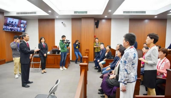 图为最高人民法院第五巡回法庭正在开庭审理案件,部分全国人大代表正在旁听。