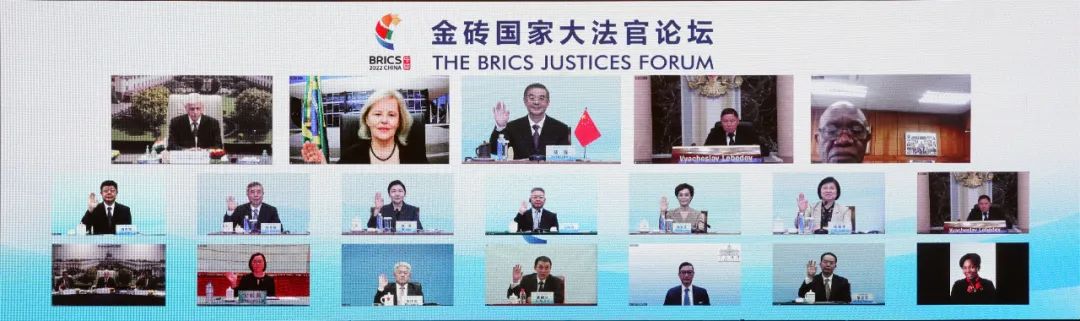 图为参加金砖国家大法官论坛的代表进行云合影。摄影 孙若丰 《共同声明》指出,金砖国家最高法院将秉持公平正义原则,平等保护各国公民权益,持续推动贸易和投资自由化便利化,促进贸易法律规则的协调统一,在成员国协商一致的基础上共同维护公平、诚实、守信的区域合作。金砖国家最高法院认同信息技术对法院工作的重要性,并将进一步加强智慧法院建设,将深化在可持续发展领域的合作,期待在金砖国家合作框架下,利用信息化手段增进国际司法协助作用,赞同继续加强法官培训和司法案例交流领域的合作。 周强代表中华人民共和国最高人民法院对论坛的成功举办表示祝贺。他指出,本次论坛围绕“新时代的金砖司法合作”主题深入研讨,与会各方在平等交流中探索司法合作新路径,在包容互鉴中共话司法为民新举措,共谋维护公正司法新路径,形成《共同声明》等许多重要共识和成果,必将有力促进金砖国家司法工作高质量发展,以更高水平司法服务促进经济社会发展。 周强表示,本次论坛深化了合作共识、增进了友谊互信、擘画了光明未来。与会各方坚持开放包容、互学互鉴,平等交流、畅所欲言,分享探索实践、凝聚合作共识,进一步夯实了互信基础,深化了彼此友谊,拓展了合作广度深度,为金砖国家司法交流注入新内涵、开启了新征程,将对各国司法领域交流合作产生深远影响。中国最高人民法院愿同金砖各国司法机关一道,始终秉持开放、包容、合作、共赢的金砖精神,进一步深化交流合作,服务金砖国家构建更加全面、紧密、务实、包容的高质量伙伴关系,用实际行动为建设美好世界作出更大贡献。 巴西联邦共和国最高法院院长、首席大法官罗沙·韦伯,俄罗斯联邦最高法院院长、首席大法官维亚切斯拉夫·列别杰夫,印度共和国首席大法官乌代·乌梅什·拉利特,南非共和国最高上诉法院大法官博伊西·姆巴分别致辞。他们表示,金砖国家大法官论坛的成功举办进一步深化了金砖各国最高法院的交流合作,与会各方结合各国司法实践,就金砖国家司法领域合作和共同关心的问题进行深入交流,达成重要共识,取得丰硕成果。希望各国司法机关继续加强交流互鉴,在国际商事纠纷化解、智慧法院建设等领域开展更多层级、更大范围的合作,携手同心应对各种挑战,把金砖国家司法领域的合作提升至新水平。 中华人民共和国二级大法官、最高人民法院副院长杨万明主持闭幕式,海南省人民政府副省长闫希军出席闭幕式并致辞。 中华人民共和国一级大法官、最高人民法院常务副院长贺荣,二级大法官、最高人民法院副院长陶凯元、杨临萍,二级大法官、福建省高级人民法院院长金银墙,二级大法官、广东省高级人民法院院长龚稼立,香港特别行政区高等法院首席法官潘兆初,澳门特别行政区终审法院法官宋敏莉,全国人大代表邓泽永,全国政协委员潘惠丽出席闭幕式。最高人民法院、海南省直机关、海南等地方法院有关代表,巴西联邦共和国、俄罗斯联邦、印度共和国、南非共和国部分大法官、法官代表,以及部分驻华使节出席闭幕式。