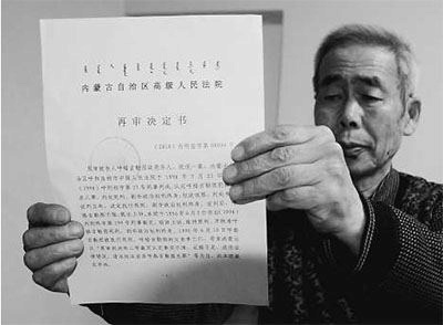 11月20日,呼格吉勒图父亲李三仁收到内蒙古自治区高级人民法院的再审决定书。 备受社会关注的呼格吉勒图案有了最新进展。11月20日上午,内蒙古自治区高级人民法院向该案申诉人、呼格吉勒图的父母送达了再审决定书,正式启动对该案的再审程序。 据内蒙古自治区高院新闻发言人李生晨介绍,高院作出再审决定,主要是根据呼格吉勒图近亲属的申诉,经过审查认为,该案符合《中华人民共和国刑事诉讼法》第242条第二项的规定,即发现“据以定罪量刑的证据不确实、不充分、依法应当予以排除”,人民法院应当重新审判。 “鉴于原审被告人呼格吉勒图已经死亡,根据刑诉法司法解释规定,我们在审理方式上将另行组成合议庭,采取书面形式审理本案。”李生晨说。 不开庭审理如何保障代理律师等人的诉讼权利?李生晨回答道:“代理律师可以通过阅卷、提交代理意见等方式履职。我们也一定会严格依法保护所有诉讼参与人的权利,包括代理律师的权利。” 此前有媒体报道称该案复查中受到干扰,对此,李生晨表示,在复查期间,没有遇到阻力和障碍。由于此案时间过长,给复查工作带来很大难度,特别是对一些证据的补查极其困难。此案事关命案,必须坚持十分慎重的态度,必须坚持以事实为根据、以法律为准绳,确保严谨细致、客观公正、高度负责地予以审查。 “在审理此案过程中,我们将认真贯彻落实十八届四中全会精神,严格依法按程序、公正及时审理此案,让人民群众感受到司法的公平正义。经过审理,如果认定该案确有错误,我们将严格依照法定程序,坚决依法予以纠正。”李生晨说。 新闻背景 1996年4月9日,内蒙古自治区呼和浩特市毛纺厂年仅18周岁的职工呼格吉勒图被认定为“4·9”毛纺厂女厕女尸案凶手。案发61天后,法院判决呼格吉勒图死刑,并立即执行。2005年,被媒体称为“杀人恶魔”的内蒙古系列强奸杀人案凶手赵志红落网,其交代的数起杀人案中的一起就是“4·9”毛纺厂女厕女尸案,从而引发媒体和社会对呼格吉勒图案的广泛关注。