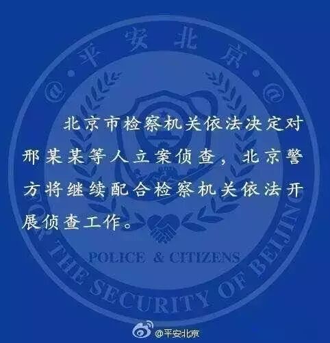 北京晨报记者从北京检方获悉,日前昌平检察院完成对“雷洋涉嫌嫖娼被民警采取强制约束措施后死亡”线索的初查工作,认为符合立案侦查条件。 根据办案的实际需要,北京检察院决定,将该案交由北京检察院第四分院立案侦查。今年6月1日,北京检察院第四分院依法决定对昌平公安分局东小口派出所民警邢某某等五人进行立案侦查,按程序通知家属。同日,北京市有关检察机关控告申诉检察部门向雷洋家属吴某某通报了检察机关办理案件情况。 记者注意到,在北京市检察院通过官方微博发布消息5分钟后,北京公安局的官方微博“平安北京”对此事表态:“北京市检察机关依法决定对邢某某等人立案侦查,北京警方将继续配合检察机关依法开展侦查工作”。 “平安北京”上一次就此事表态是2016年5月19日,“平安北京”发布消息称:“北京市公安局对雷洋案高度重视,事发后立即责成昌平公安分局及时通报检察机关,并积极配合开展调查工作,相关人员接受调查。公安机关坚决尊重事实、尊重法律,坚决依纪依法处理,决不护短。”