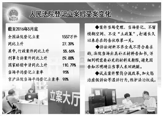 “能不能胜诉先不说,至少我能痛痛快快立上案,心里舒服多了。”河北省衡水市的张先生说出了很多当事人的心声。 立案是案件进入司法环节的第一步,法院不给当事人立案就像是医院不给病人挂号。但长期以来,确实有一些案件,由于种种原因,进不了法院的大门。2015年5月1日,全国人民法院变立案审查制为立案登记制,仅仅两字之差,带来的影响却是巨大的。 《法制日报》记者今天从最高人民法院获悉,截至2016年5月底,全国法院共登记立案1557万件,同比上升27.39%。其中,行政案件同比上升55.66%,刑事自诉案件同比上升59.88%,国家赔偿申请同比上升110.79%,当场平均登记立案率为95%,北京、上海法院达到98%。 一年多来,人民法院用行动兑现了“有案必立,有诉必理”的庄严承诺,人民群众收获到了满满的获得感。亲身体会到立案登记制改革带来的实效后,案件当事人、律师、人大代表等纷纷反映,以往立案难问题已不再存在。一位在辽宁省沈阳市皇姑区人民法院办事的律师说:“实行立案登记制是人民法院有史以来最彻底、最有效的改革。” 打通群众告状难第一关 虽说立案登记制针对的是所有诉讼,但真正懂行的人知道,最主要的得利者还是想打行政官司的老百姓。在立案审查制的法律背景下,一些面广量大、矛盾尖锐复杂、政策性强,特别是被称为“民告官”的行政案件,不可避免地被挡在法院大门外,人民法院立案难问题反映突出。 立案登记制改革后,案件当场受理、当场登记、不留模糊空间、不设“土政策”,打通了长久以来存在的告状难第一关。 立案登记制改革实施后,黑龙江省龙电律师事务所主任李亚兰代理的案件再也没有出现过立不了案、求告无门的情况。她说:“当事人打官司入门不再难,是律师听到最多的声音,也是最喜欢听到的声音。” 据最高人民法院立案庭相关负责人介绍,以往人民群众反映突出的立案难,主要集中在立案环节的过度审查以及人为设置障碍。如一些法院过度审查主体资格、证据材料,一些法院以地方“土政策”人为限制立案等。实行立案登记制后,各级法院对应该受理的案件,一律敞开大门,确保人民群众在立案这一首要环节感受到公平正义,将立案难的帽子扔进了历史的垃圾堆。 清华大学法学院教授王亚新认为,立案登记制改革意味着为当事人通过诉讼程序主张权利寻求救济降低门槛或打通渠道,也意味着法院及相关部门需要转换观念,努力突破内部和外部种种不利于当事人诉权保障的制约因素或条件,在依法受理案件上做到敢于承担。 揣着问题来带着满意走 8月8日,临近中午下班时间,小刘拿着3份请求法院帮助调查证据的申请书,急匆匆地来到诉讼服务中心,江苏省泰州市海陵区人民法院立案庭庭长徐秀芳当场帮其办理了手续,刘先生的脸上满是笑意。 徐秀芳告诉记者,对外服务群众、对内服务审判,一定要让群众揣着问题来,带着满意走。海陵区法院立案中心每年立案近1万件,类似这样的事例每天都会有。 辽宁省沈阳市和平区人民法院院长李清杰认为,过去立案难,除了法院审查过严,一部分案件无法通过司法途径解决,从程序上感觉难外,还有两个原因:一是部分当事人诉讼能力较低,不清楚立案的要求,从心理上感觉难;二是当事人立案时,享受不到优质的诉讼服务,从情感上感觉难。 改革后,人民法院对当事人提交的诉讼材料不齐全或不符合要求的,会当场出具补正材料告知书,详细列明需要补充的材料及期限,让当事人一目了然地知道所缺材料,避免了因告知不明确让当事人来回跑腿的现象,进一步减轻当事人诉累。 法院多辛苦换得百姓少跑路、少受累。记者采访中了解到,多地法院以立案登记制改革为契机,创新诉讼服务机制,为当事人提供形式多样、方便快捷的诉讼服务。上海增设自助立案登记室,设立“法院ATM机”,开通网上立案。福建泉州市法院推行异地立案,为群众提供跨地域、家门口、标准化、最便捷的诉讼服务。 繁简分流化解案多人少 立案登记制度改革极大地方便了群众诉讼,减轻了当事人诉累,使立案难问题成为历史,但法院案多人少矛盾却更加突出。 实行立案登记制改革后,作为全国基层法院的收案大户,北京市朝阳区人民法院民一庭法官人均未结案超过500件,民二庭法官人均未结案超过400件。 中国人民大学法学院教授陈卫东说:“案件大幅增长,法院案多人少矛盾更加突出,而且虚假诉讼增多,是立案登记制改革后面临的新问题。立案只是诉讼的第一个关口,案子进了法院,下一步就是如何又好又快地审结。” 针对诉讼机制不完善,繁案不精、简案不快、效率不高等问题,最高法推动案件繁简分流改革试点。 在广东,法院把70%的简案交给30%的法官办理,把30%的繁案交给70%的法官办理,实现“复杂案件精审、细研、慎判,简单案件及时、简审、快判”。深圳市福田区人民法院还成立司法辅助中心,集约化处理诉讼材料收转、外出送达等事务性工作。 如何解决滥用诉权问题,一直是立案登记制改革的难题。 立案登记制伊始,“赵薇瞪我”等一系列奇葩起诉理由引起网络热议。部分滥诉、虚假诉讼、恶意诉讼进入诉讼程序,不仅挤占了正当案件当事人寻求司法帮助的空间,浪费了宝贵的司法资源,对法律尊严、社会秩序亦造成破坏。 最高人民法院针对虚假诉讼等滥诉行为,已出台新规,加大惩治力度,维护法治